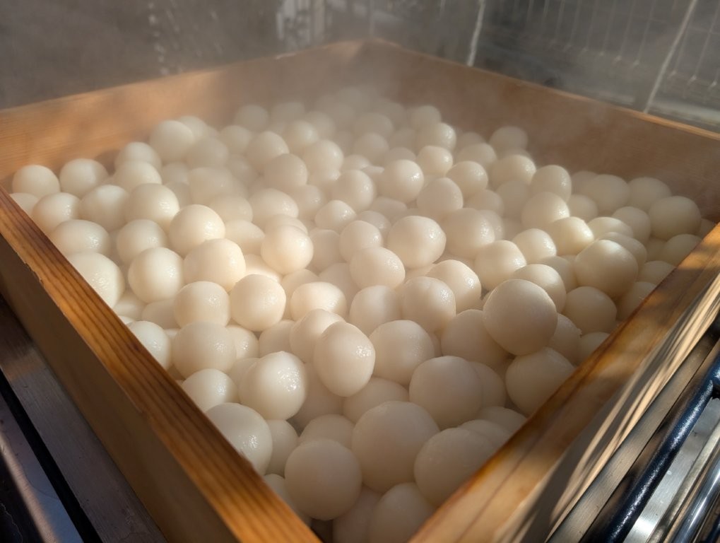 お餅つきでも使うボイラーやセイロを用いてお団子を蒸かしますが、